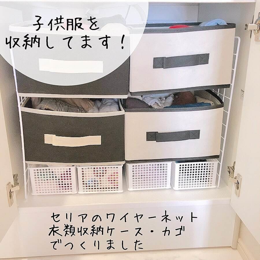 子ども服の収納棚に使ったものは、100均のワイヤーネット、衣類収納ケース、プラスチックカゴの3アイテム。 洗面台下は配管があって使いにくい場所ですが、スペースを上手に活用していますね。