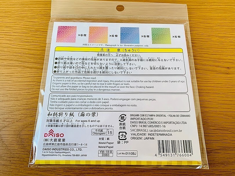 内容量は4柄×6枚の計24枚入っています。大きさは標準的は折り紙サイズ、15×15cmです。