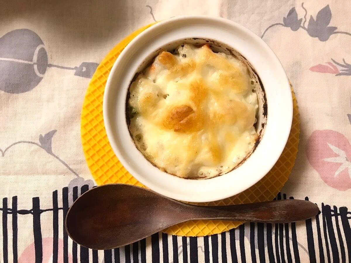 茹でたマカロニ(あれば)とポテトサラダを混ぜ、チーズを乗せてオーブンで焼けば完成です。
