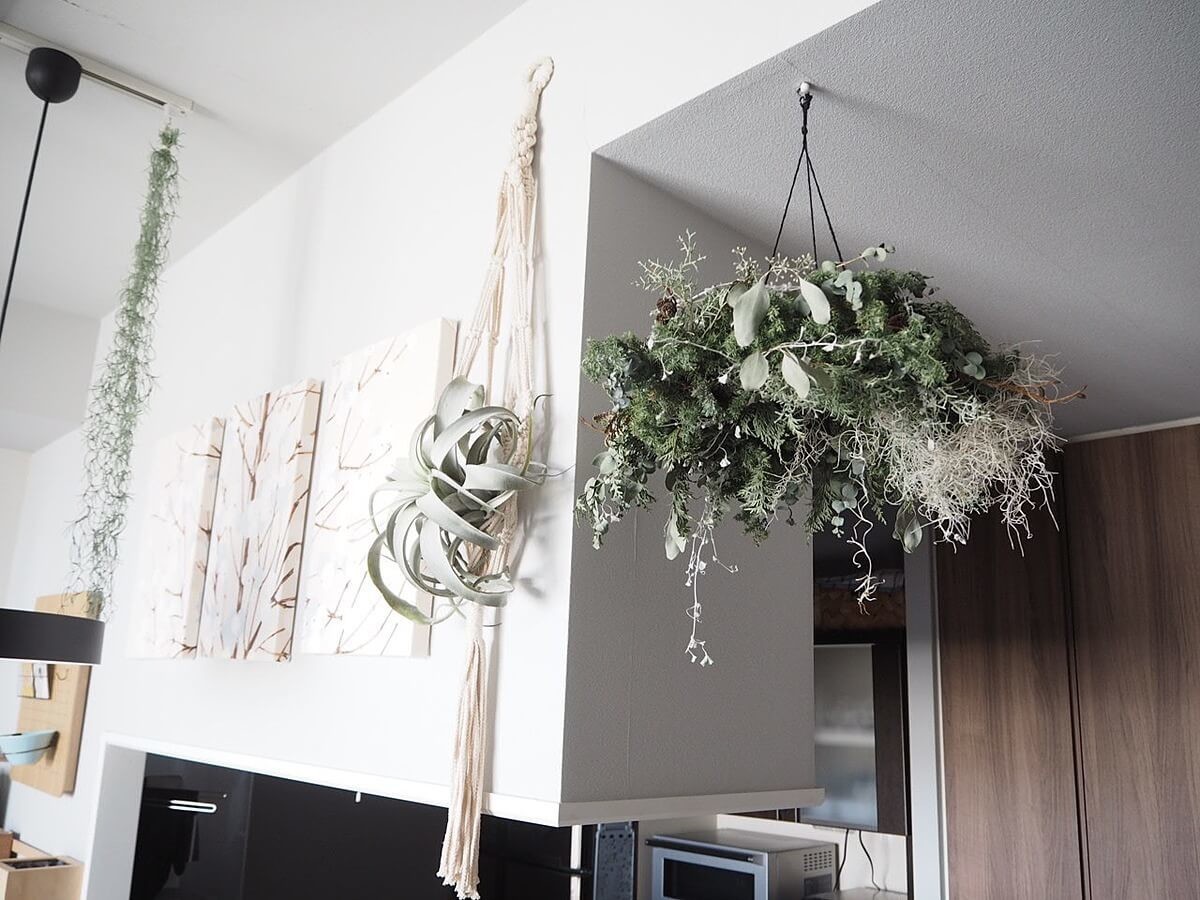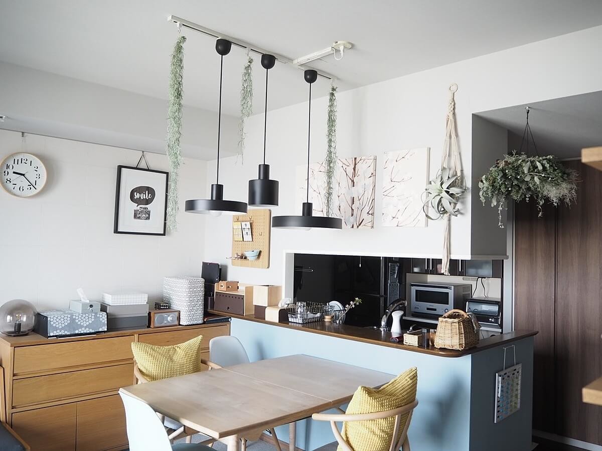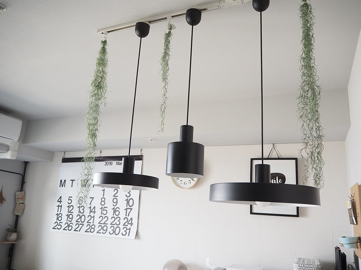 我が家ではダイニングテーブルの上に目立つペンダントライトを3つ形・サイズ違いで吊るし、さらにフェイクグリーンも一緒に吊るしたりして意識的に目線を上げるようにしています。