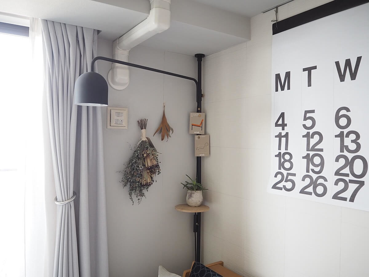 さらに、部屋のコーナーにも突っ張り式のライトを高い位置に設置して、目線を上げる工夫をしています。