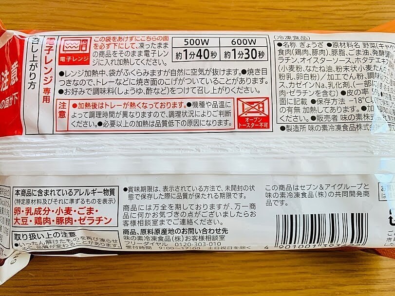 こちらも製造者は冷凍餃子の王様、味の素です。これはもう間違いないでしょう!でもスーパーなどで売っている味の素の冷凍餃子は水・油無しのフライパン調理なので、味に違いがあるのでしょうか?