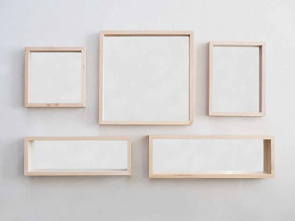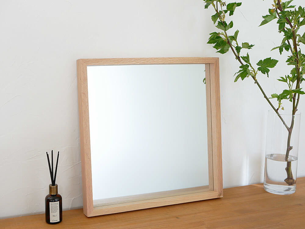 どこにでも飾りやすい正方形の「OAK WOOD エクル スクエア ミラー」はSとLの2サイズ。 (Sサイズ W32×D5×H32cm、Lサイズ 50×D5×H50cm)