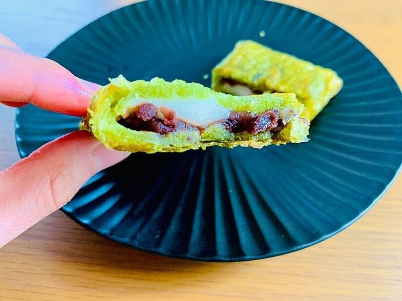 おお!?春巻きのような軽い噛み応え。中のもちフィリングがやっわらかーーーい!とろりとした食感。あんこもしっかり入ってる!サクサクでほんのり温かくて、あんこともちの相性最高!