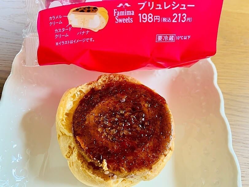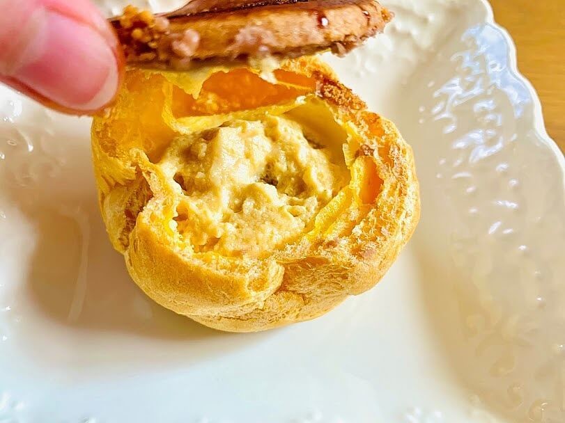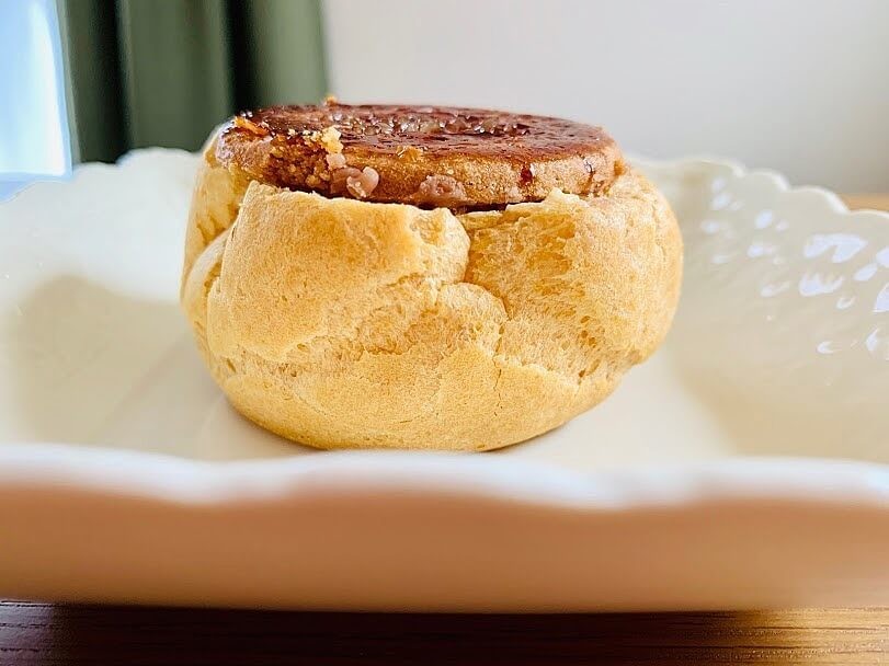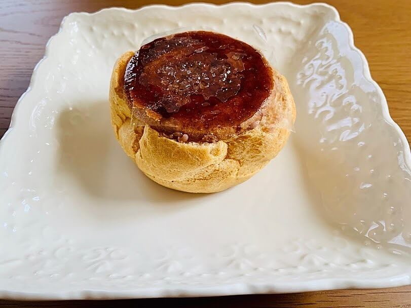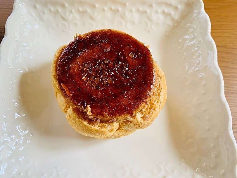 わ~可愛い!小ぶりだけど凝ってる!下は普通のシュー生地のようだけど、上がブリュレ感満載ですね。ケーキ屋さんで売っていそうな見た目。