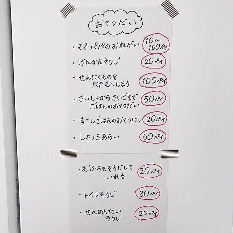 わが家では、勉強や、お風呂掃除、玄関掃除、洗い物などのお手伝いをすると、それぞれ「ママペイ」を付与。「ママペイ表」を作っています。