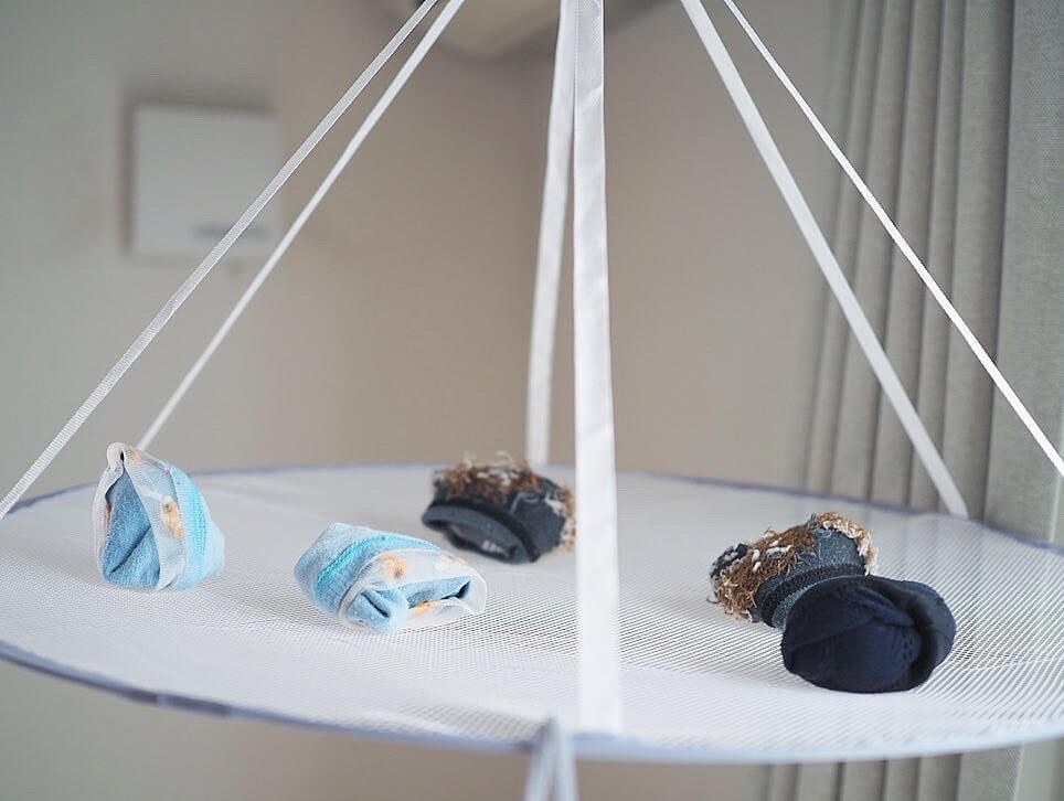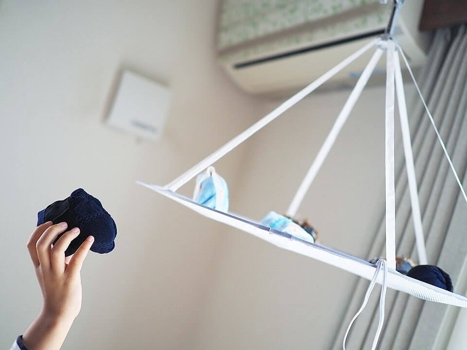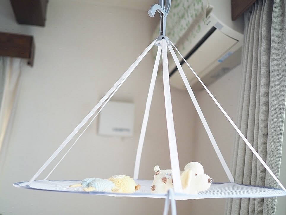 セーター干しネットは便利なフック付きなので、カーテンレールに引っ掛けたり大人が持って高さ調節をしてあげてくださいね。