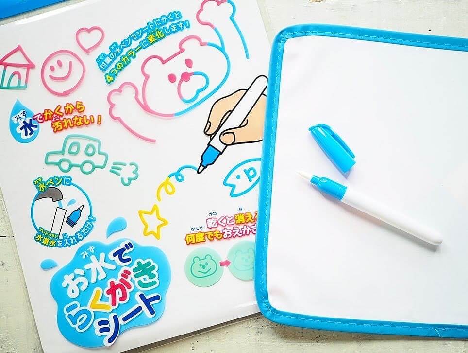 こちらはセリアで購入した「お水でらくがきシート」。シート1枚に水ペン1本が付属しています。