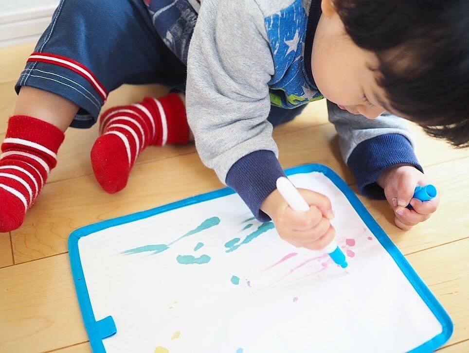 付属のペンに水道水を入れれば準備OK。透明の水なのに、ピンク・青・黄色・緑のカラフルなお絵かきが楽しめますよ。