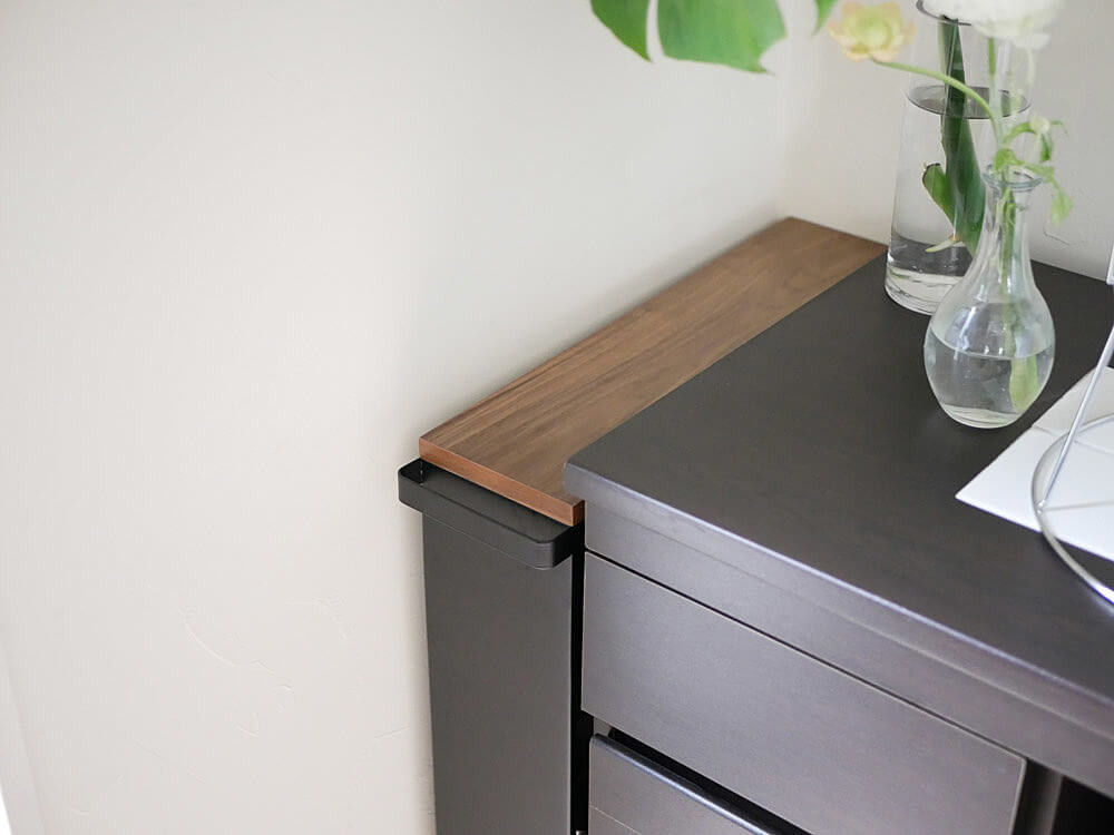 天板はしっかりとした天然木の化粧繊維板なので、ちょっとした作業台代わりに重宝するんです。