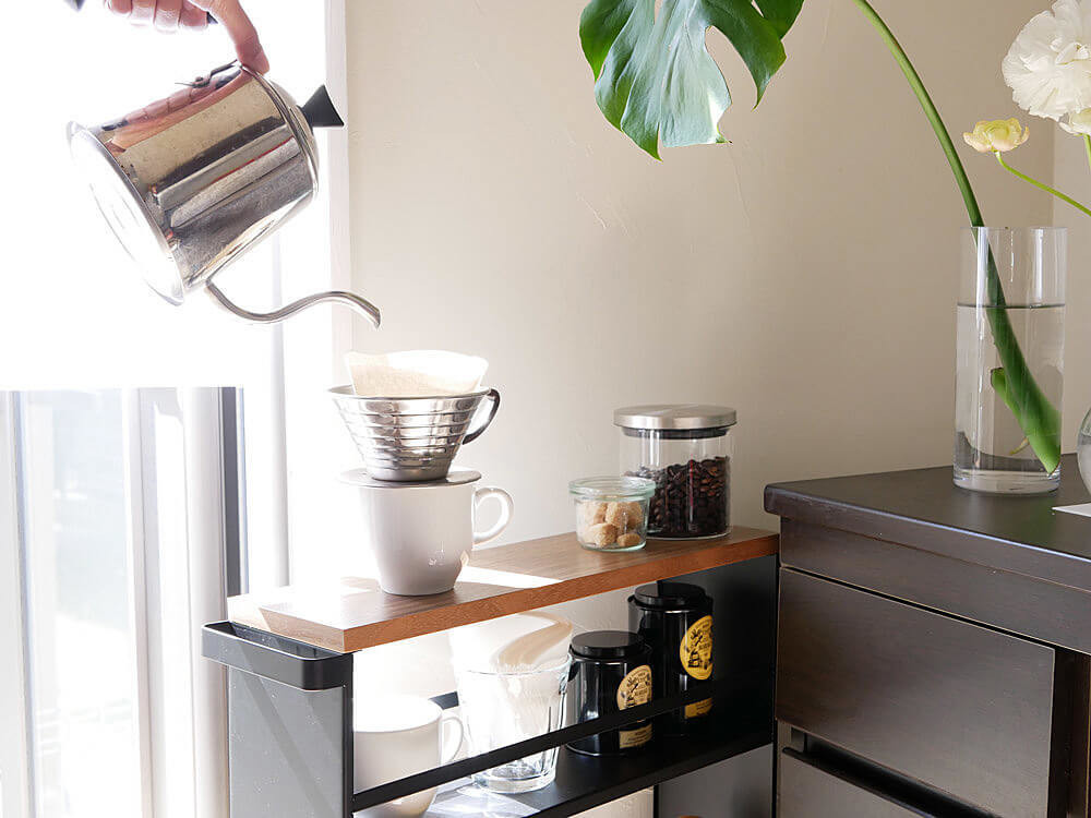 コーヒー豆や紅茶、マグカップなどをまとめて収納すれば、ティータイムの準備もスムーズに!