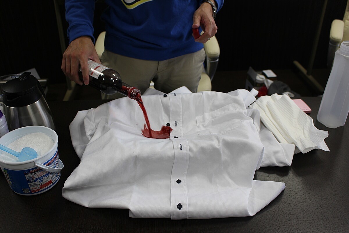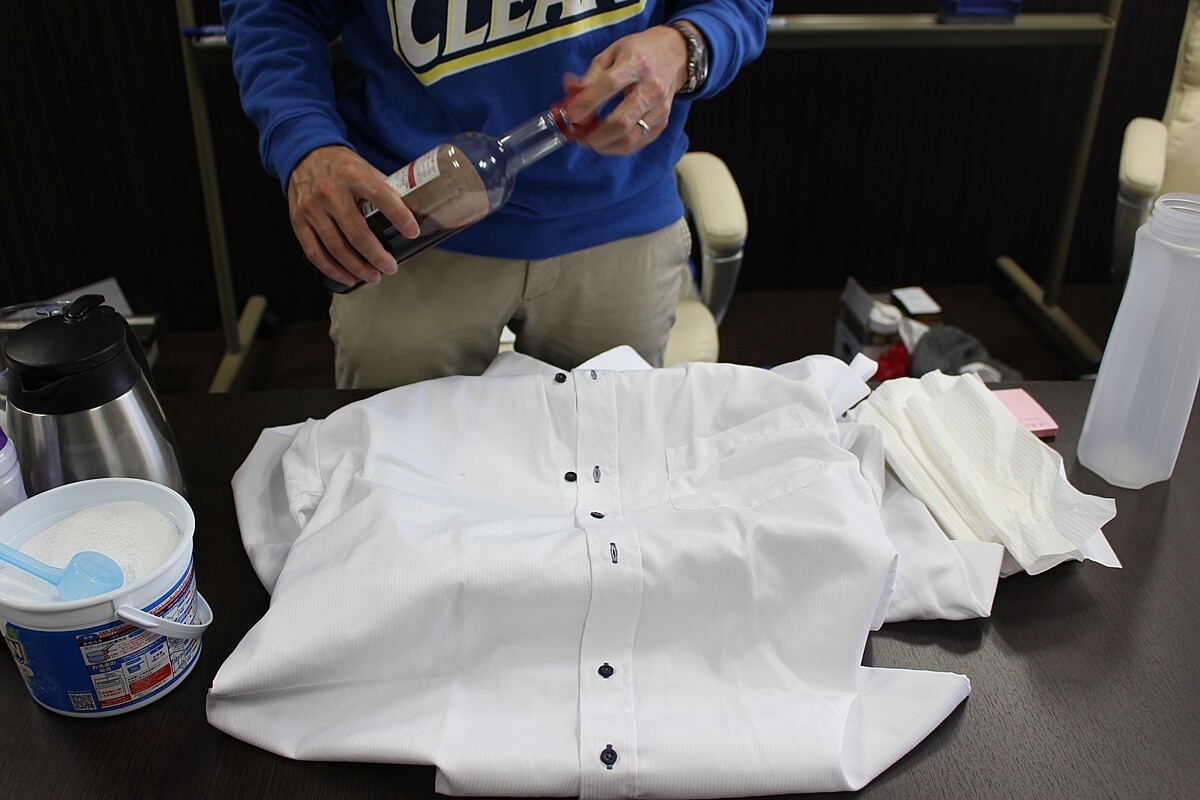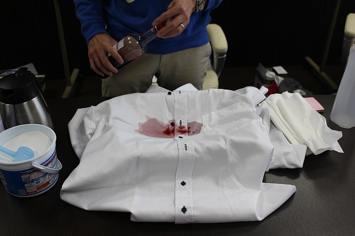 今回は田邊さん自ら、真っ白なワイシャツを赤ワインとお醤油で汚して、オキシクリーンで落としてくれます。