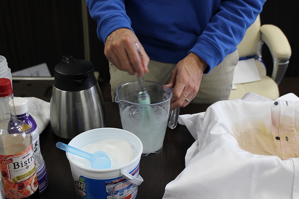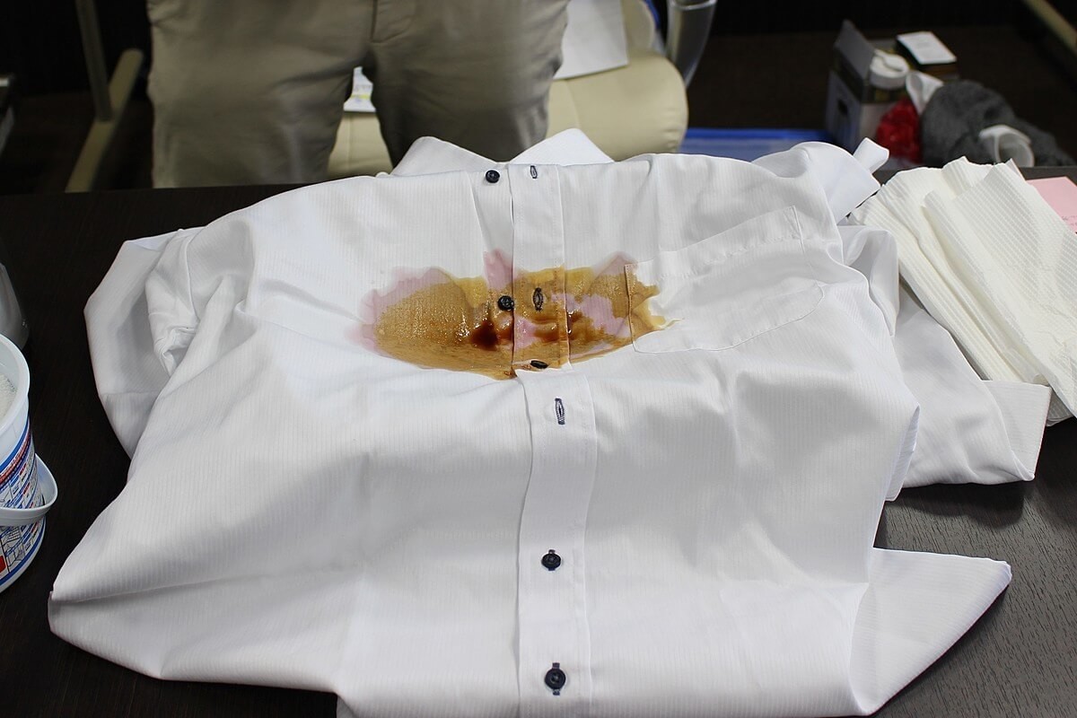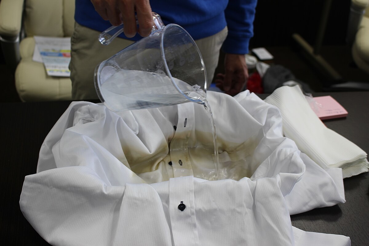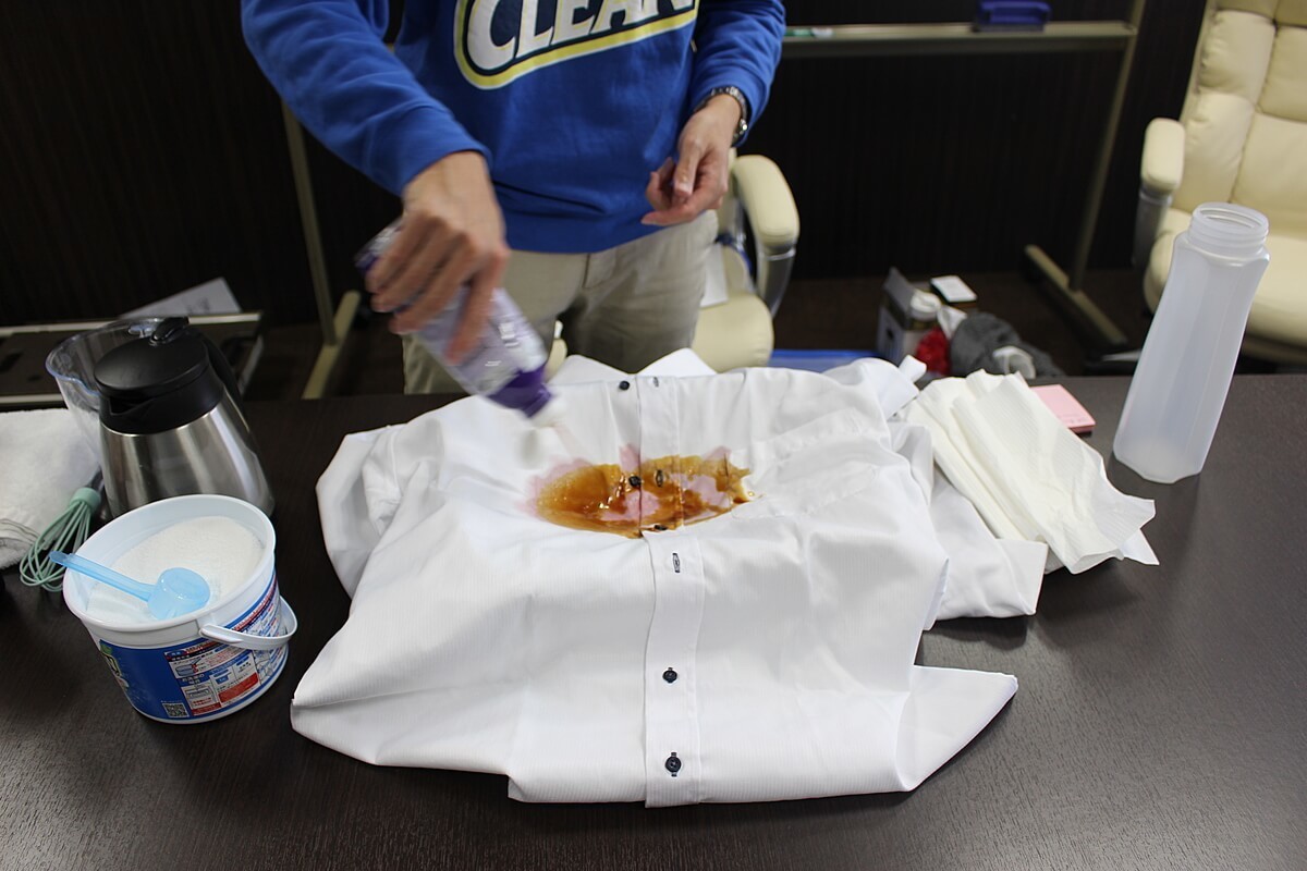今回は田邊さん自ら、真っ白なワイシャツを赤ワインとお醤油で汚して、オキシクリーンで落としてくれます。