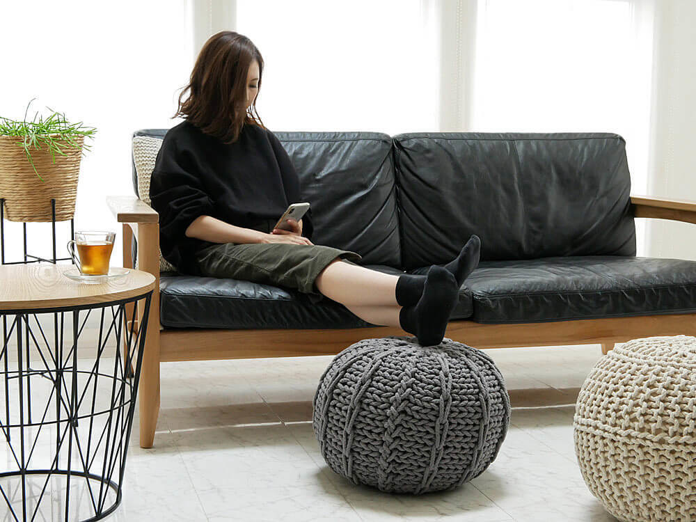 ソファーの前に置いて、オットマンとしても丁度いい高さのニットプフ。リラックスタイムに欠かせないアイテムです。