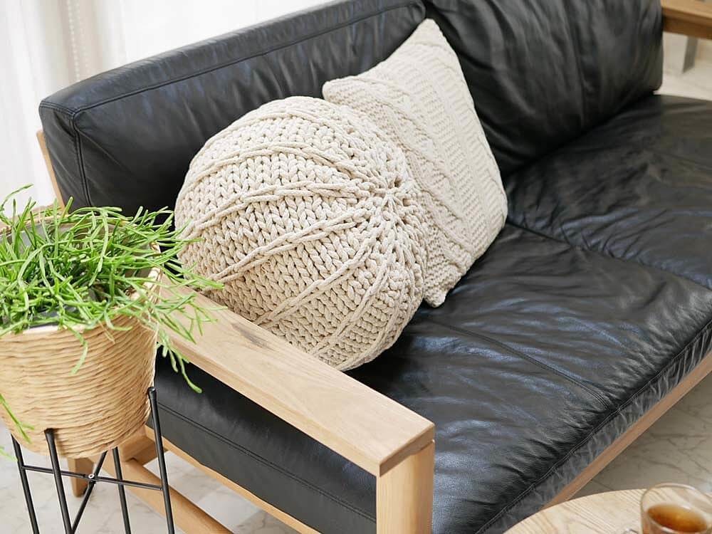 ベッドやソファーに、背置きクッションとしても使えるニットプフ。