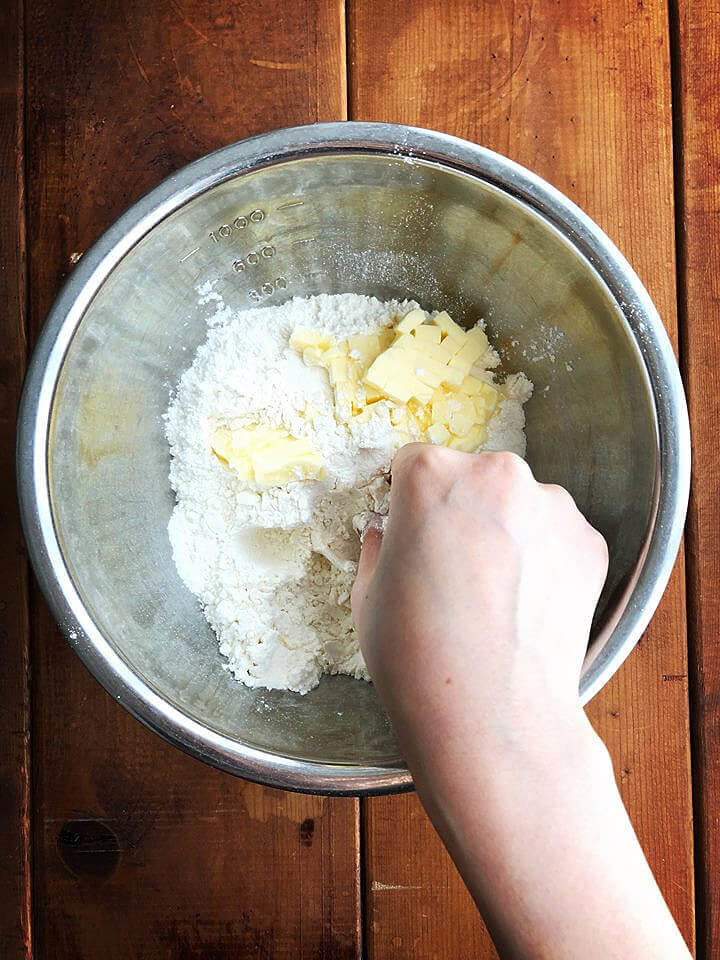 ボウルにホットケーキミックスを入れ、その上に5mm角くらいに切ったバターを乗せて