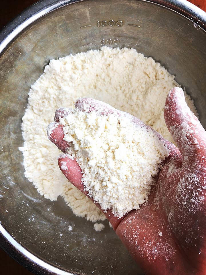 手でバターを潰すように、ホットケーキミックスと馴染ませます。