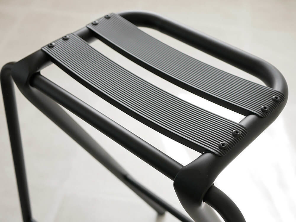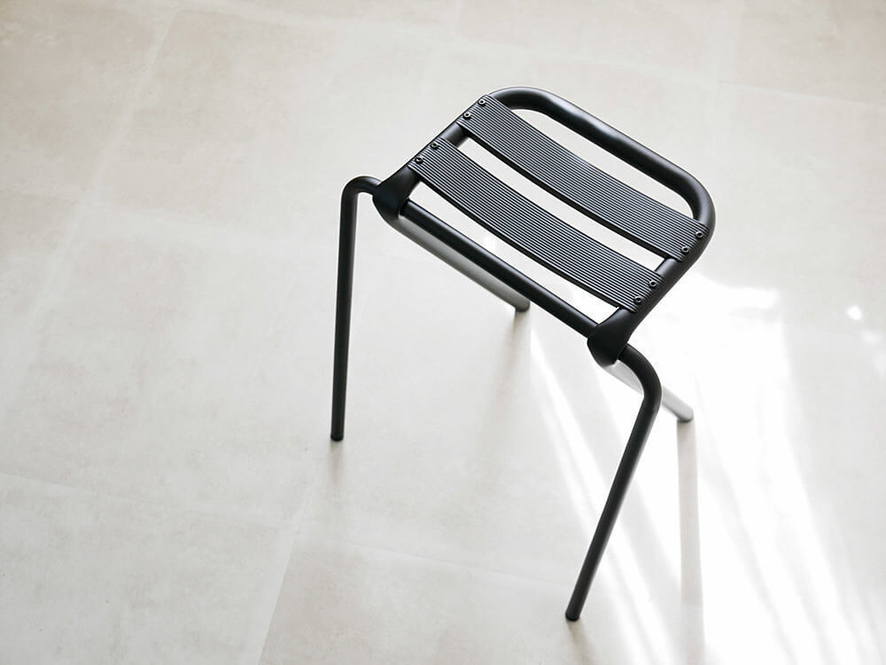 落ち着きのあるマットブラックの塗装が、スツールの美しいシルエットと彫刻的な佇まいをよりいっそう際立たせています。