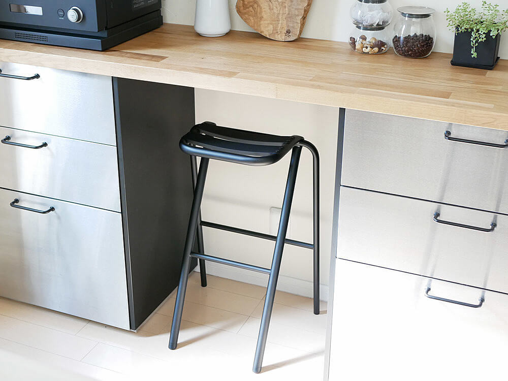 キッチンでは、調理中の休憩や、ちょっとした作業用にあると便利なスツール。