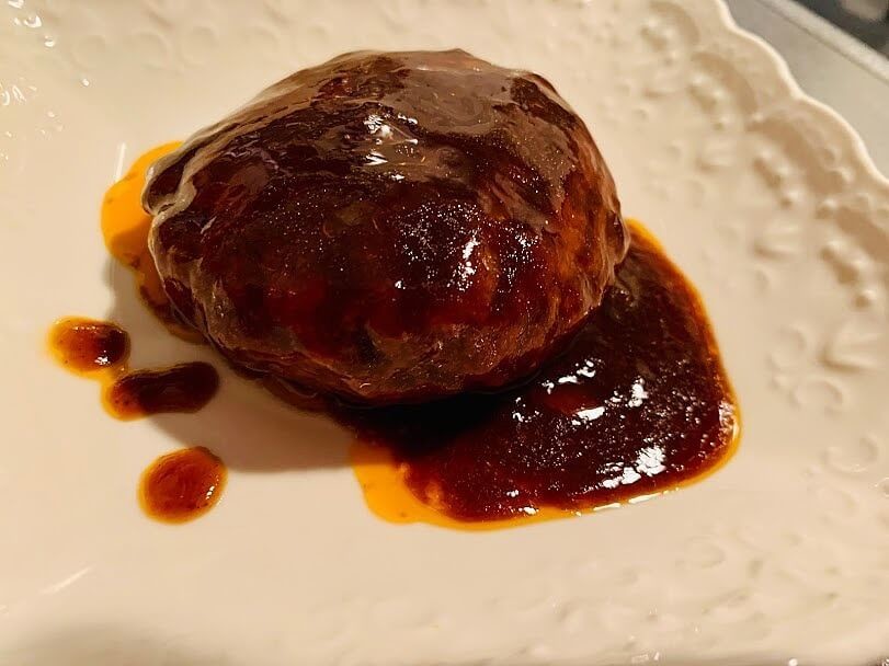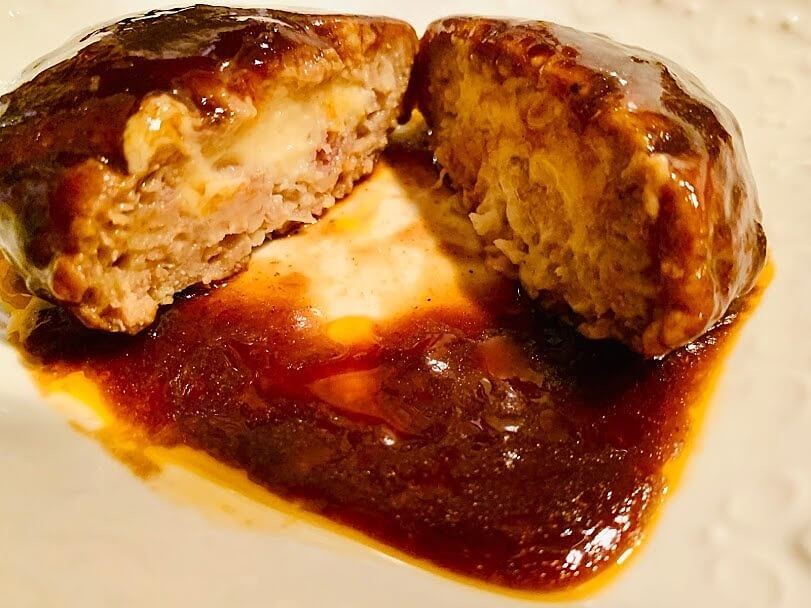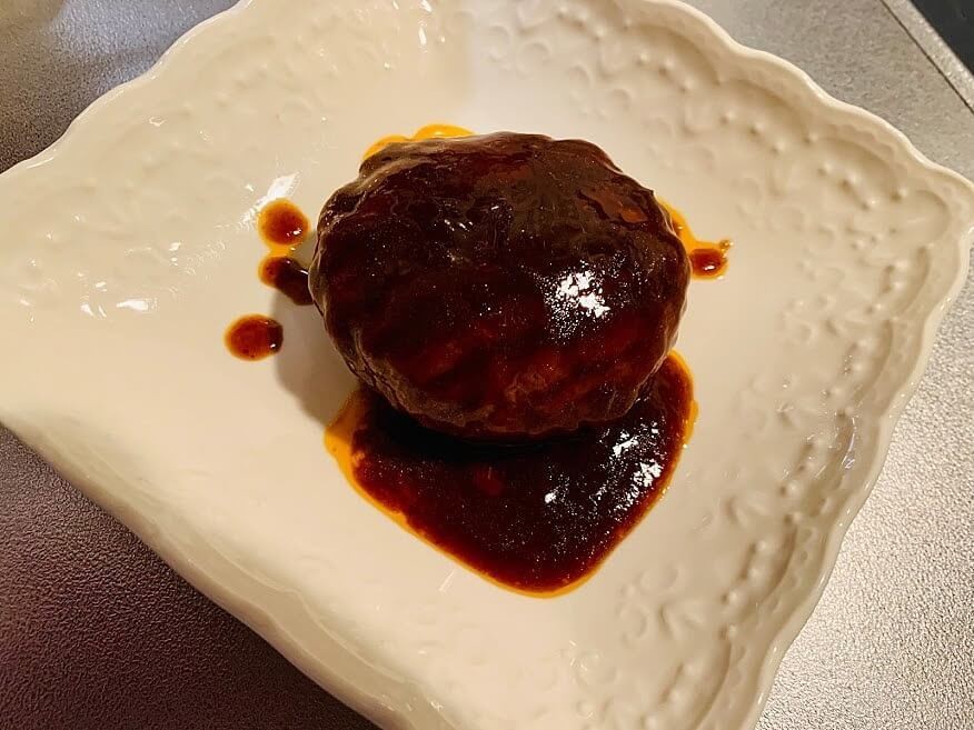 できました~!コロンと厚みのある形です。デミグラスソースもたっぷりと。