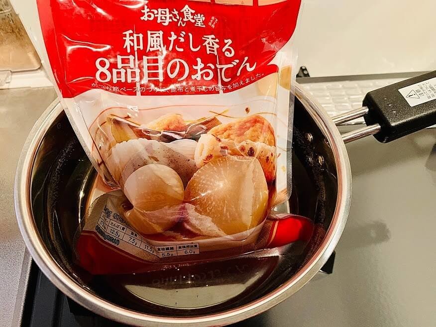 袋のまま湯煎でも、開封して鍋に入れて直接温めてもOKです。