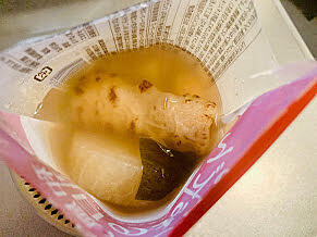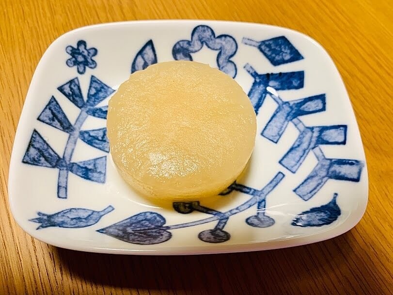 大根も、おでんでは1、2位を争う人気者ですよね。おだしが染みた良い色です。すっとお箸が刺さる柔らかさ。味はもう、おだし染み染み!美味しい!大きさは約6cmです。