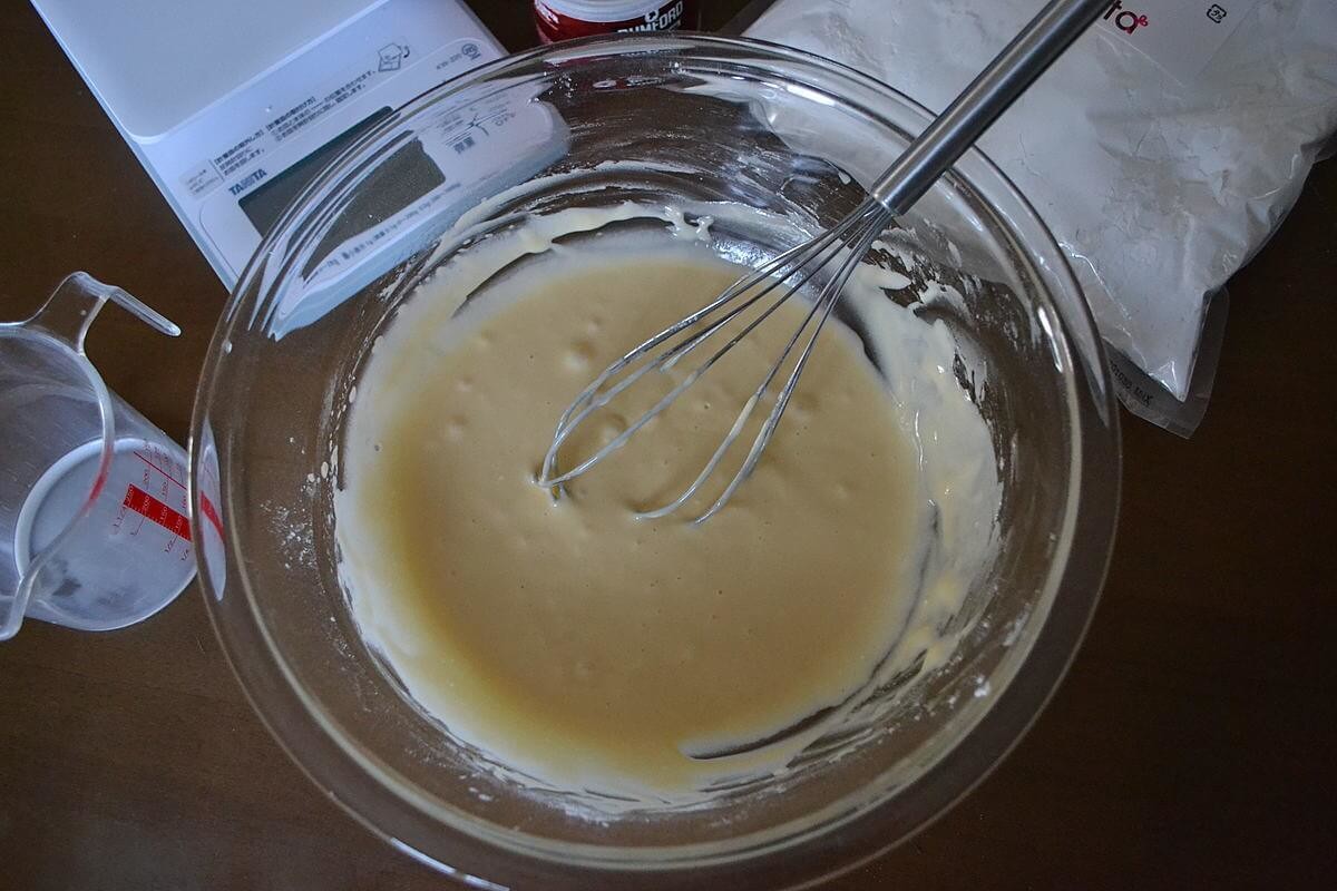(2)①に自家製ホットケーキミックスを2~3回に分けて入れ、その都度混ぜたら生地のできあがり