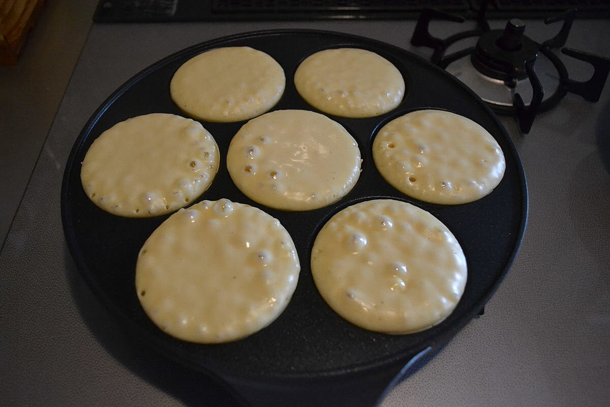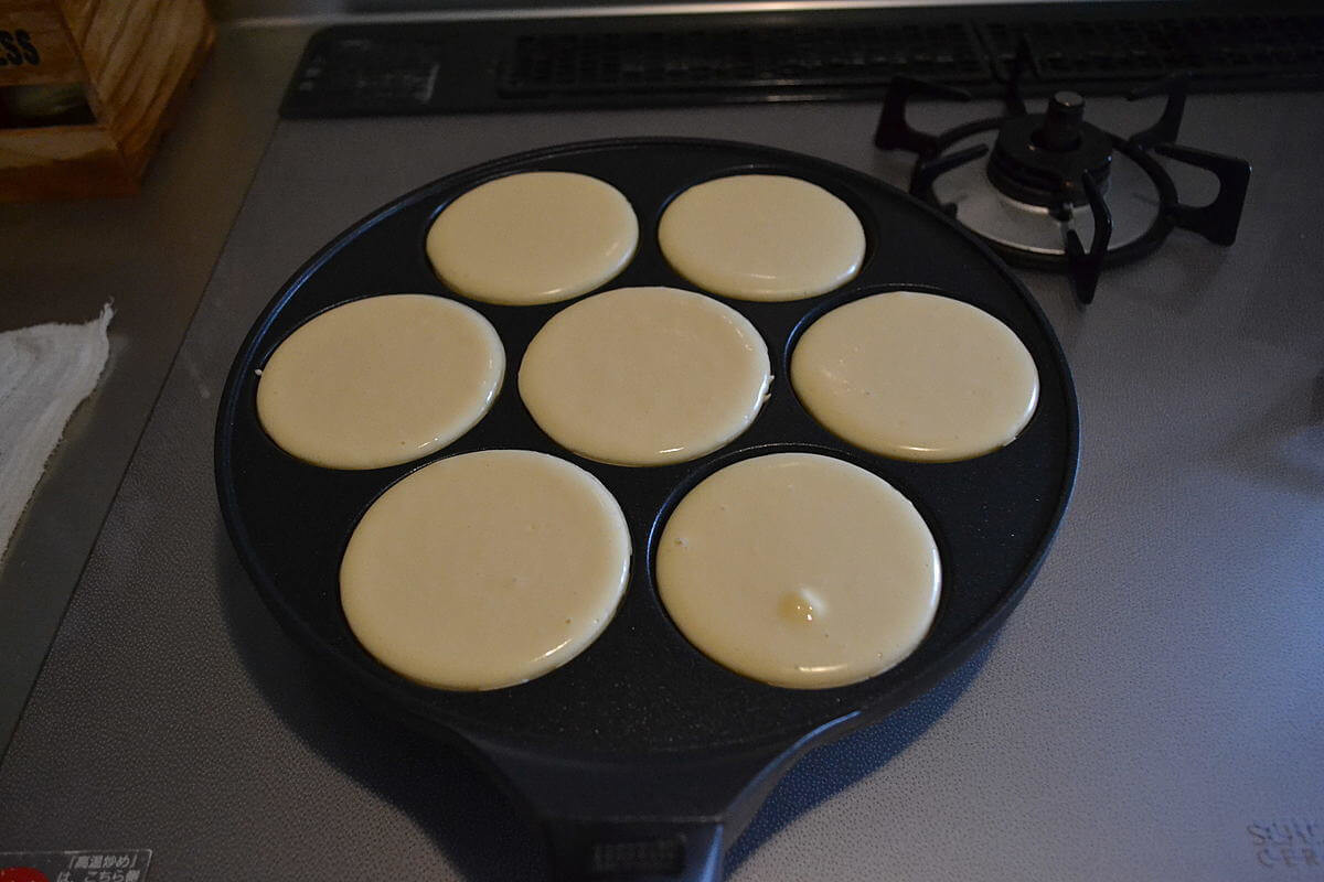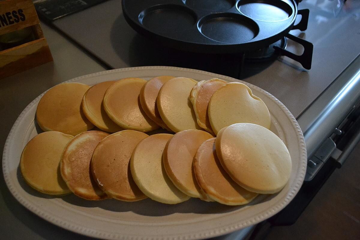 上記の材料で、直径8cmのパンケーキが14枚焼きあがりました。