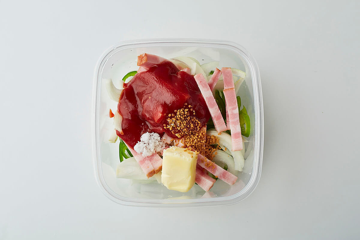 レンジ調理に欠かせないのが、耐熱容器。余ったときはそのまま保存できます。下記レシピでは、プラスチックの容器を使用します。角型は材料を入れやすく、加熱ムラが少ないので調理に向いています。汁気がこぼれないように、ある程度深さがあるものを選んで。