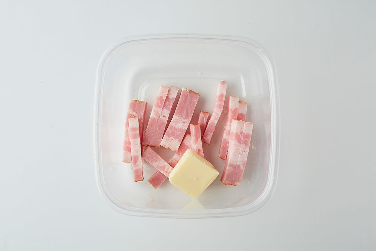 ①耐熱容器にベーコン、バターを入れ(a)、冷凍うどんをのせてラップし、(b)5分加熱する。