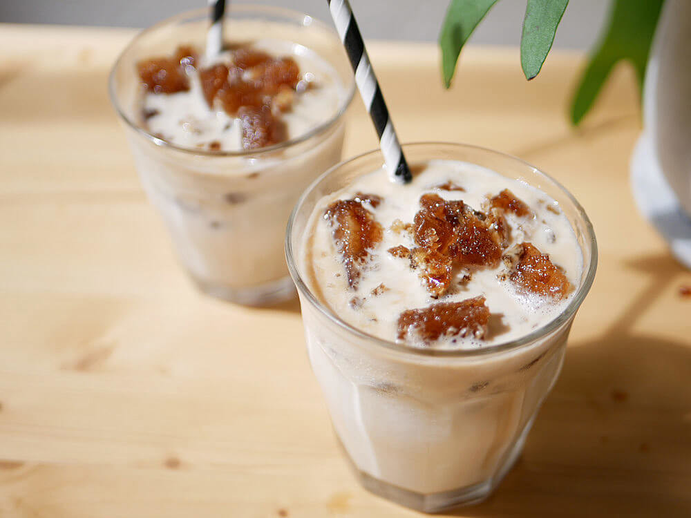 凍らせたコーヒーをグラスいっぱいに入れて、そこにミルクを注げば「氷コーヒー」の出来上がりです。