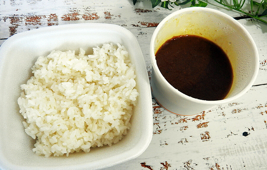 カレーとごはんは別々の容器に入っています。カレーが入っている容器は倒れやすいので、持ち帰り時にはひっくり返らないように気を付けましょう。