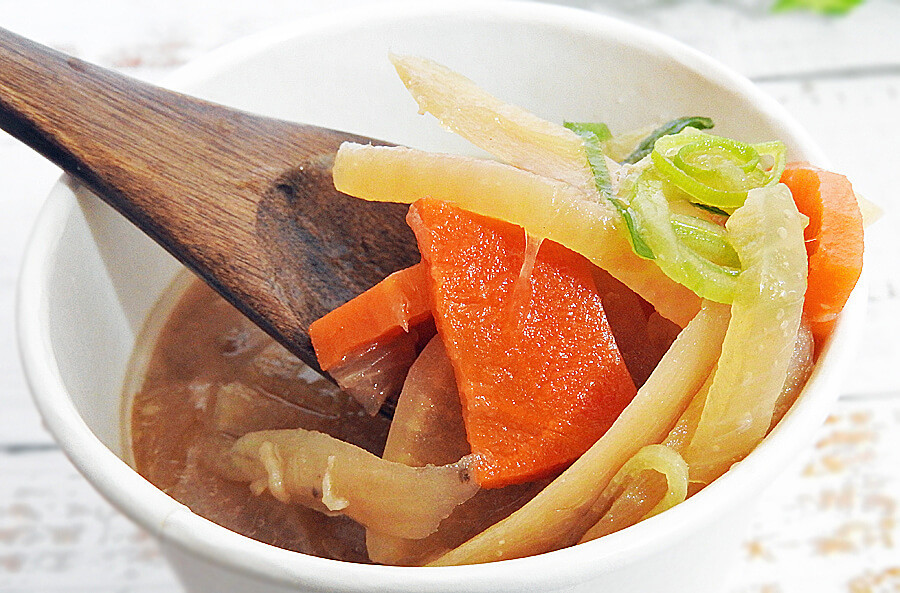 吉野家のとん汁は具材がたっぷりと入っていいますので、満足度は高め。スプーンですくいあげてみると、大根・にんじん・ねぎ・ごぼうなどがごっそり取れました!