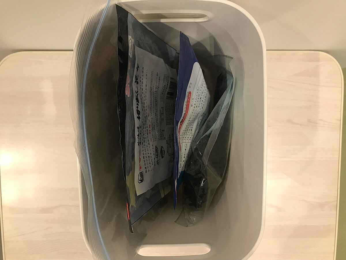 こちらは軽いものをいれるのにおすすめで、中サイズは、ふりかけやコーヒーセット・飲み物セット・乾物などファイルボックスにいれるには量が少ないけれどジャンル分けしたいものにとても使えます。