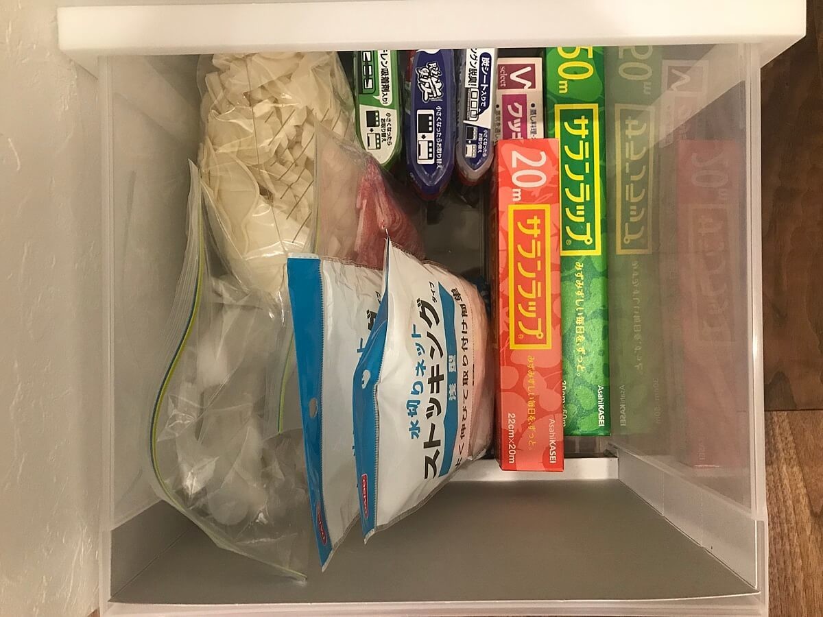 あまり低い位置は頻繁に使う物をいれておくと使いにくいので、こちらは食品でなくキッチンで使う消耗品をいれるのに使っています。