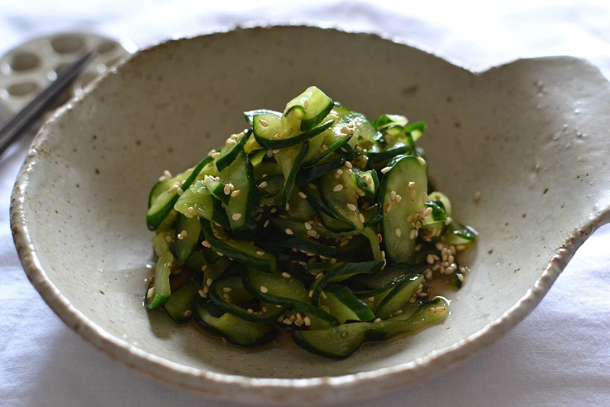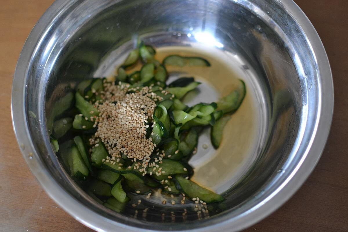 (3)きゅうりの水分を絞ってポン酢・白炒りごまと和えたらできあがり