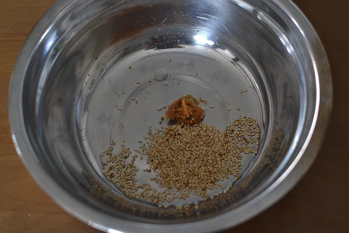 (1)ボウルに味噌・酢・白炒りごまをよく混ぜ合わせる