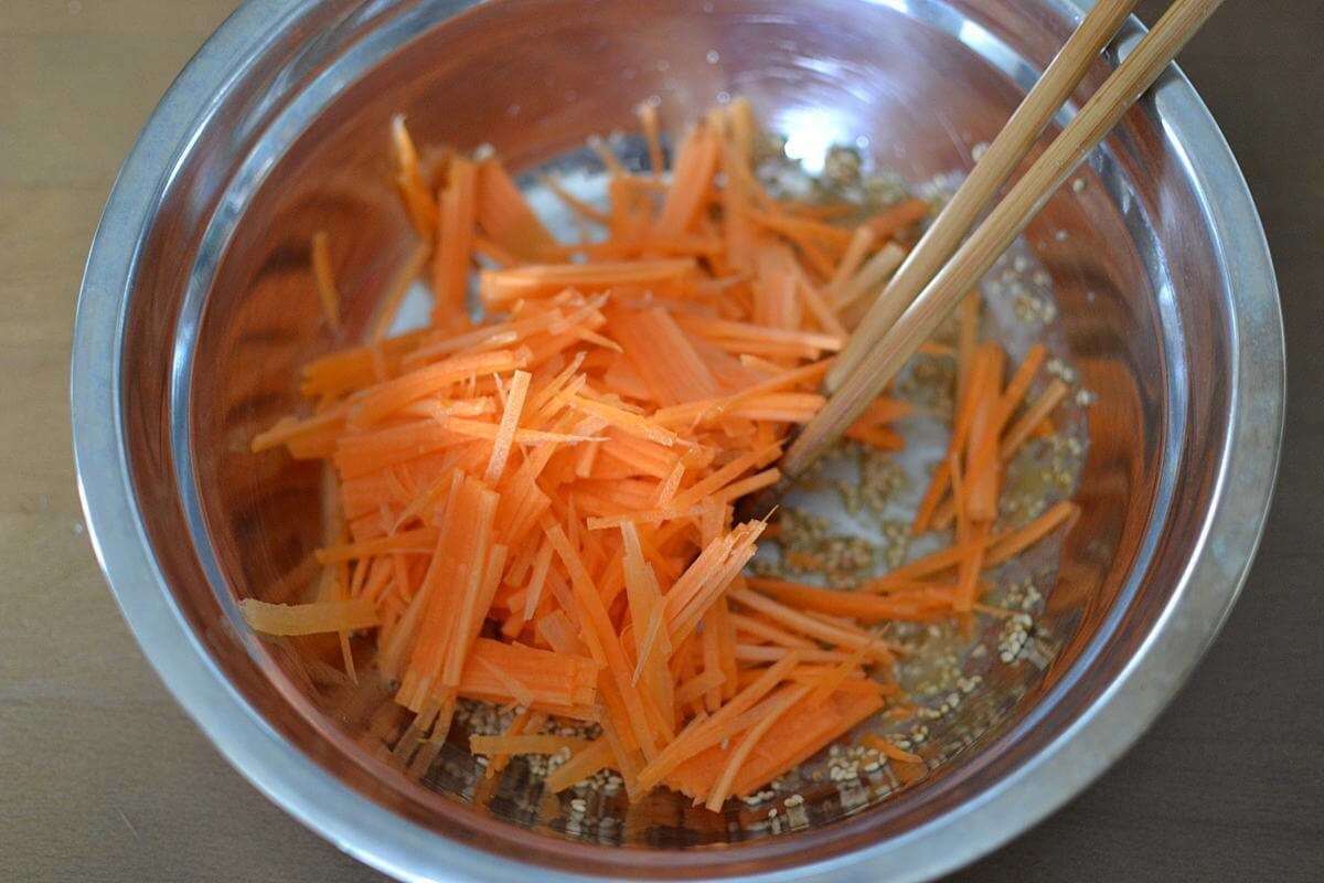 (2)千切りにんじんを①に入れ和えたらできあがり