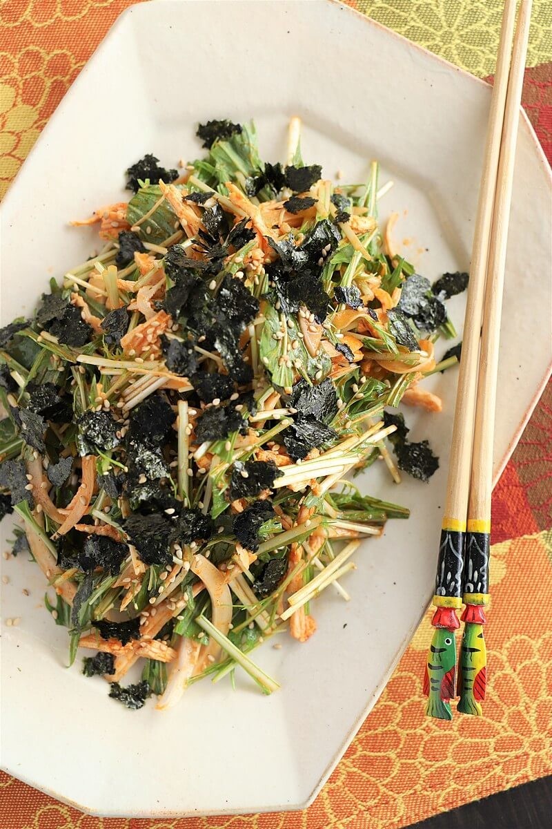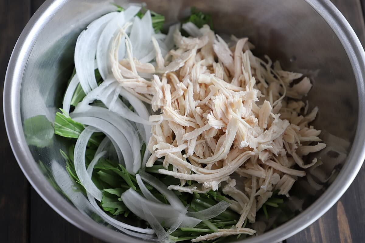*新玉ねぎではない場合、薄切りにしてから水にしばらくさらしてから水けを良く切ります - 写真上のように裂いたむね肉、水菜、新玉ねぎをボウルに入れ、ざっくりとあえ(写真下)、よく混ぜた☆印の調味料を入れさらにあえ、器に入れ、もみ海苔、胡麻をかけたら出来上がりです。