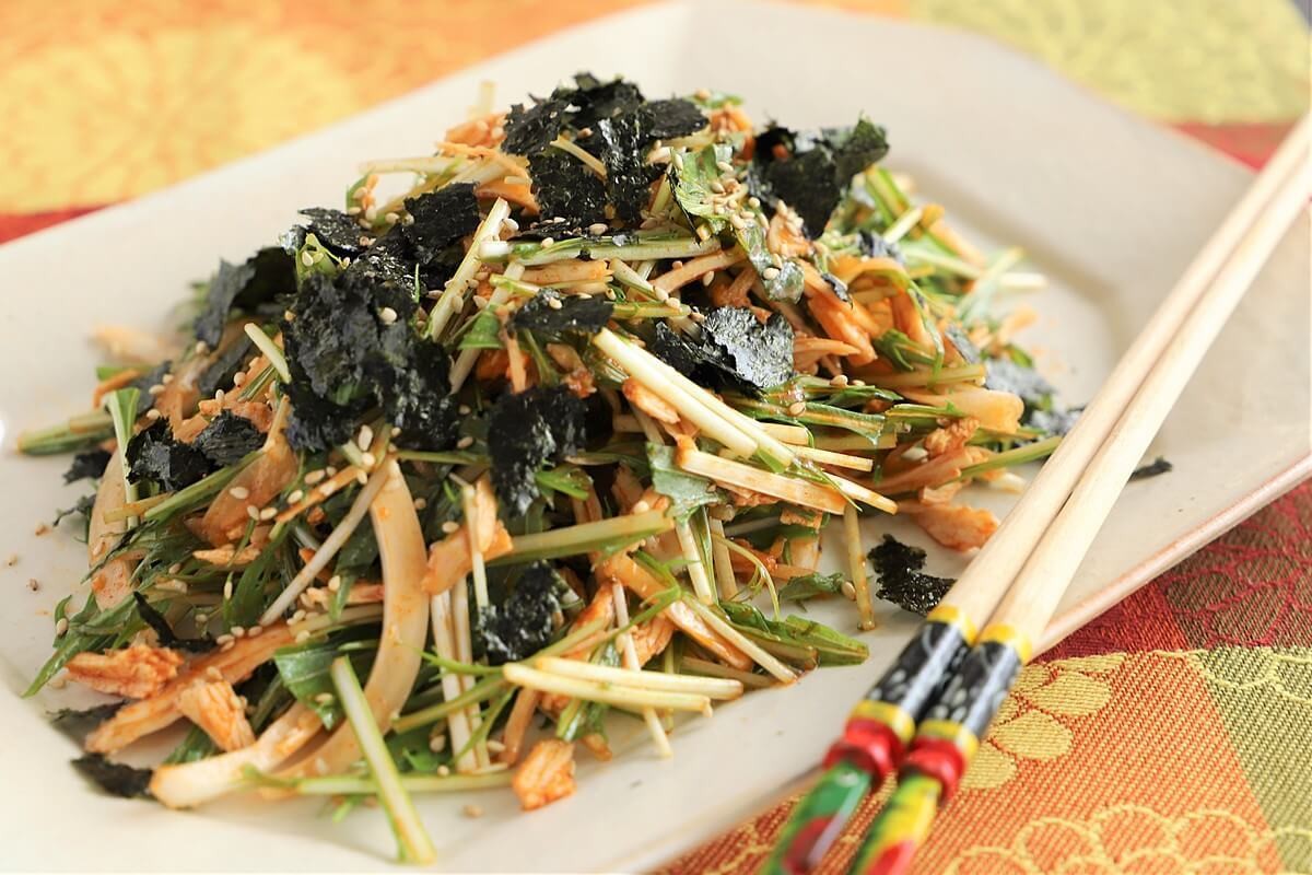 スライサーで作った人参の千切りや大根の千切りを水にさらし、よく水分を切ったものや、レタス類や、キュウリもよく合います。