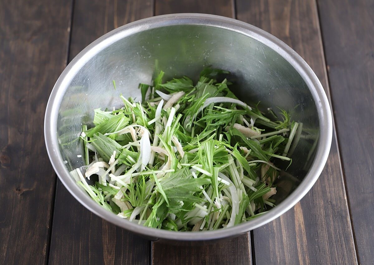 - 水菜は良く洗い、水けをきり、3cm幅ほどに切ります。