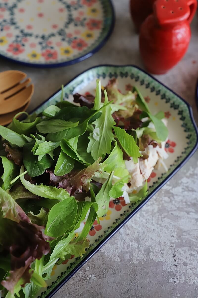 レンチン蒸し鶏を1~2cm幅に切り、新玉ねぎのスライスと、ベビーリーフをのせた簡単サラダです。
