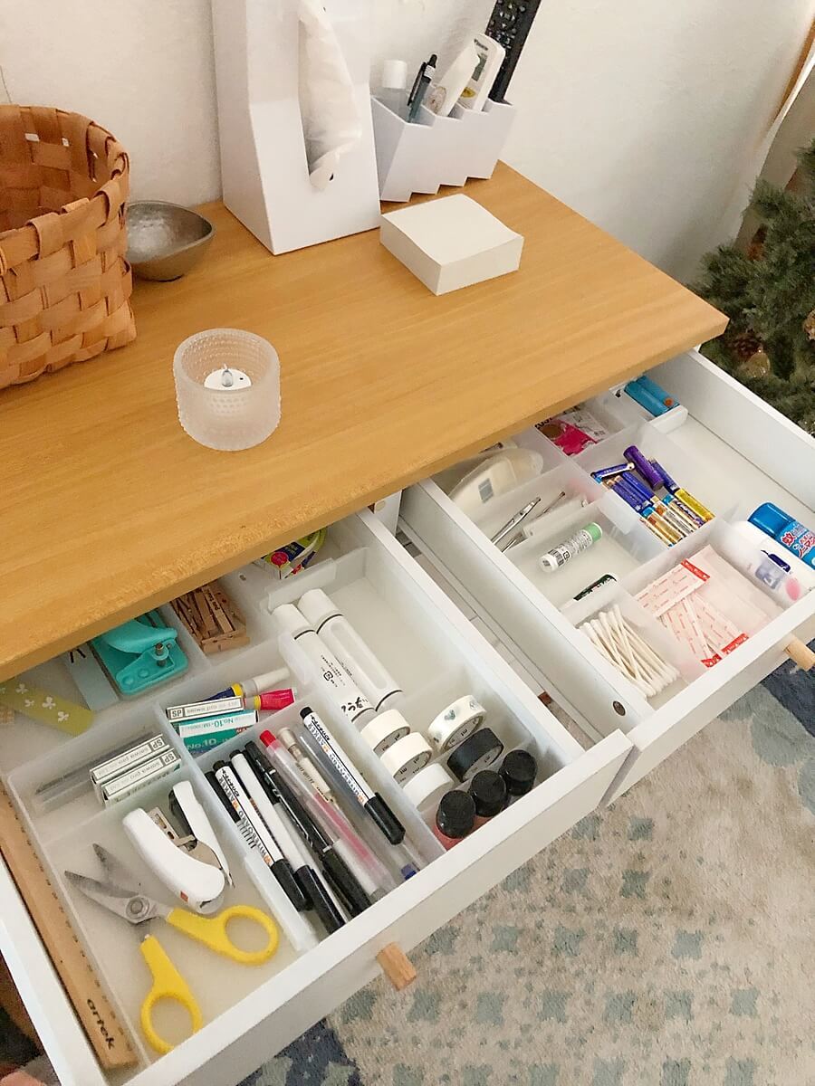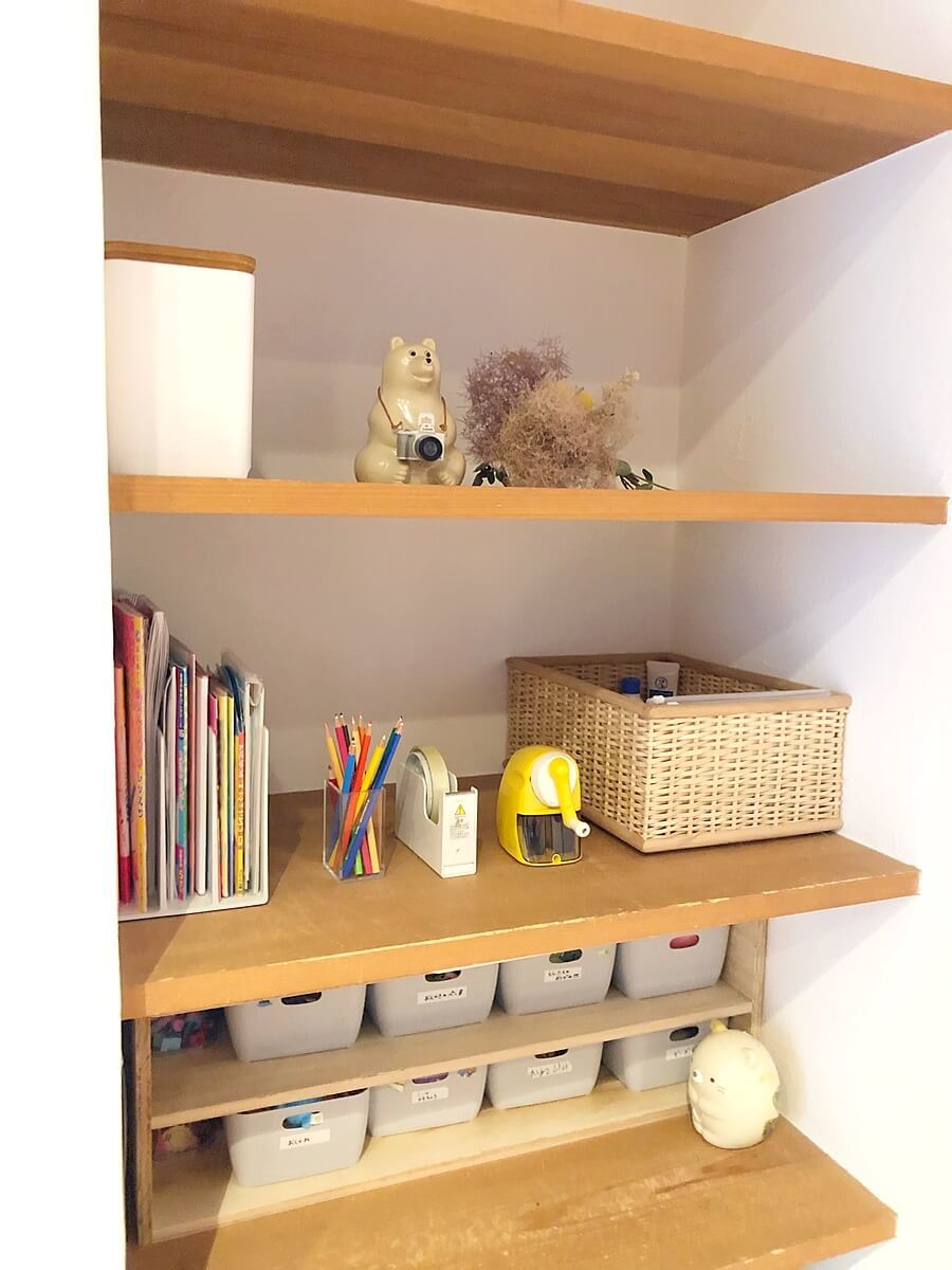 こういった子どもの使うものって、そのまま見せていても可愛かったりするので、引き出しに戻さず、あえてインテリア的に「見せる収納」としています。