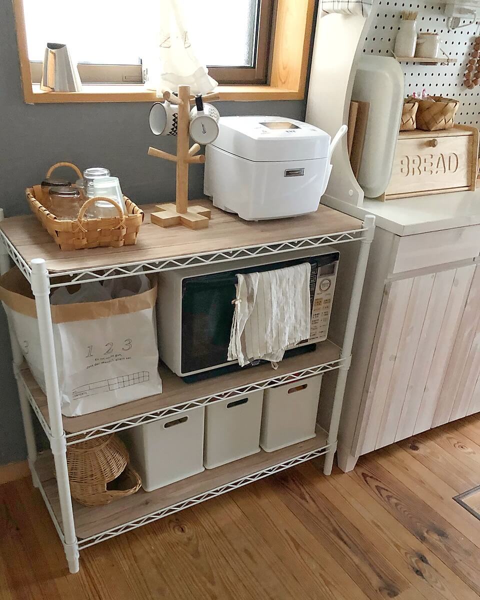 こちらはキッチン周り。 かご収納を駆使しているゾーンです。カゴは置いてあるだけでインテリアとしても楽しめますし、ナチュラルインテリア派さんにはおすすめのアイテムです。