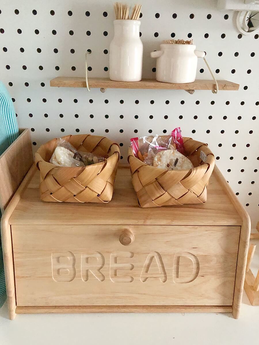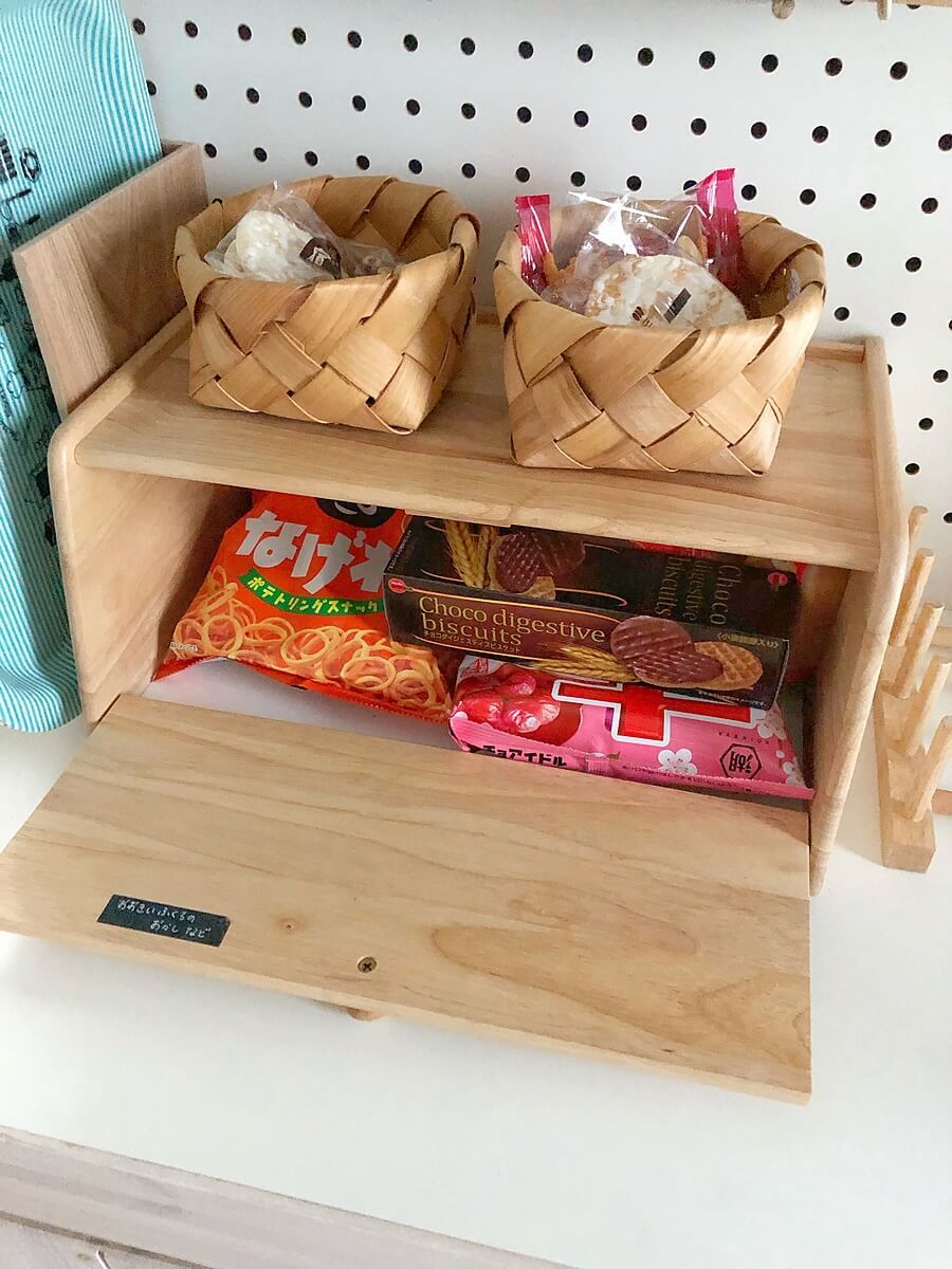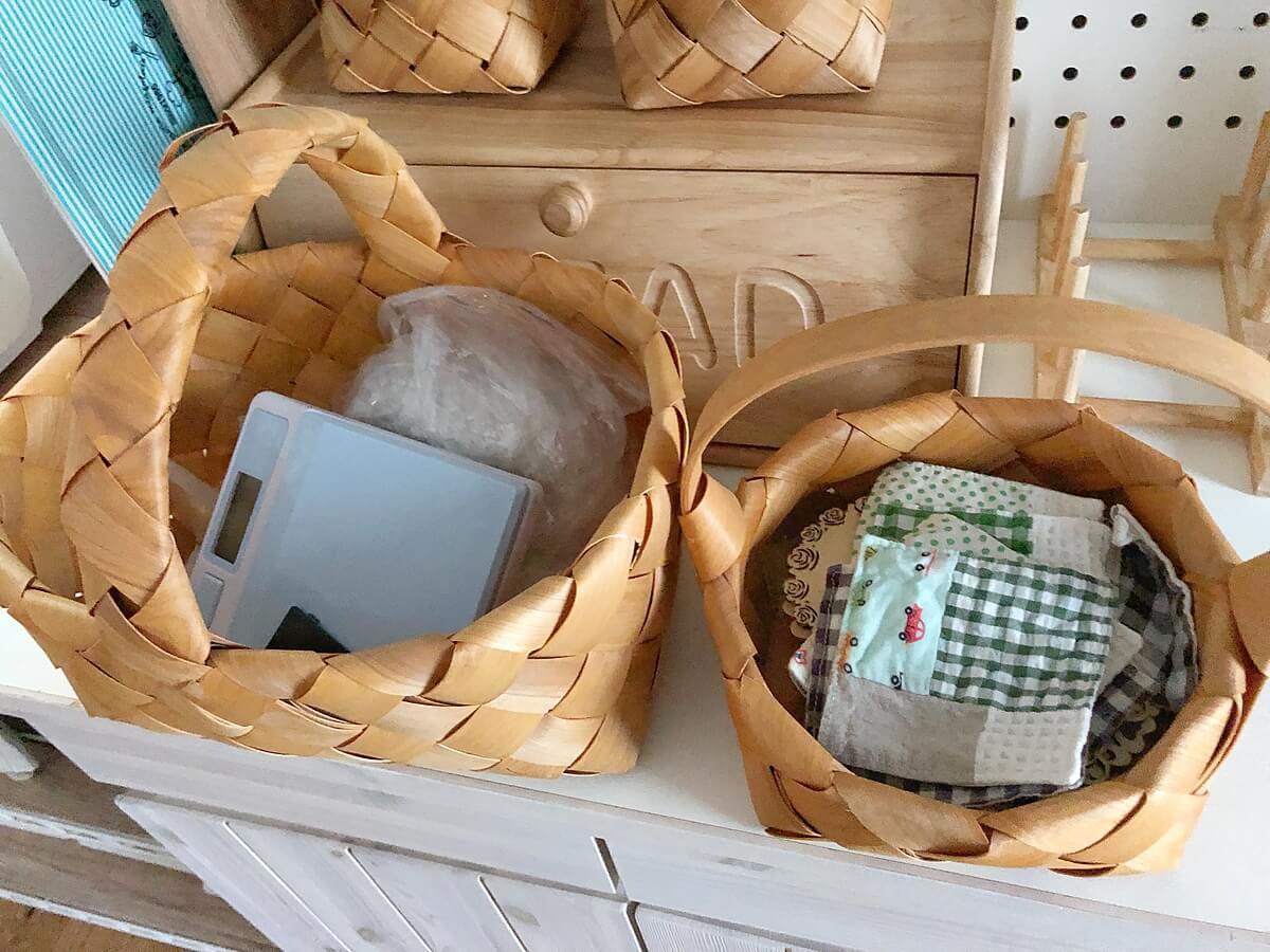 セリアで購入した水杉バスケット2つは子どもたちの細々したおやつを収納しています。このまま食卓に運んでおやつを食べています。