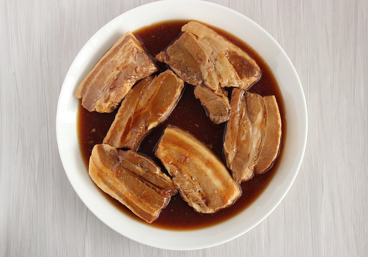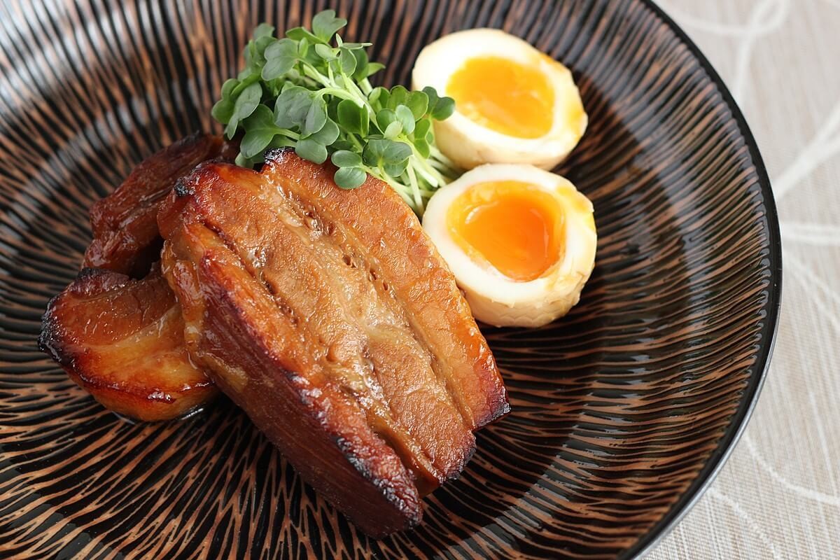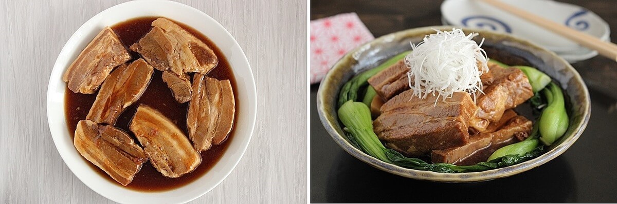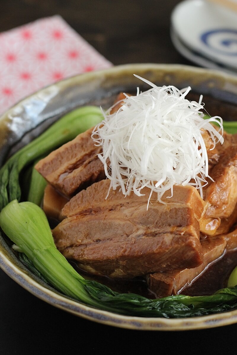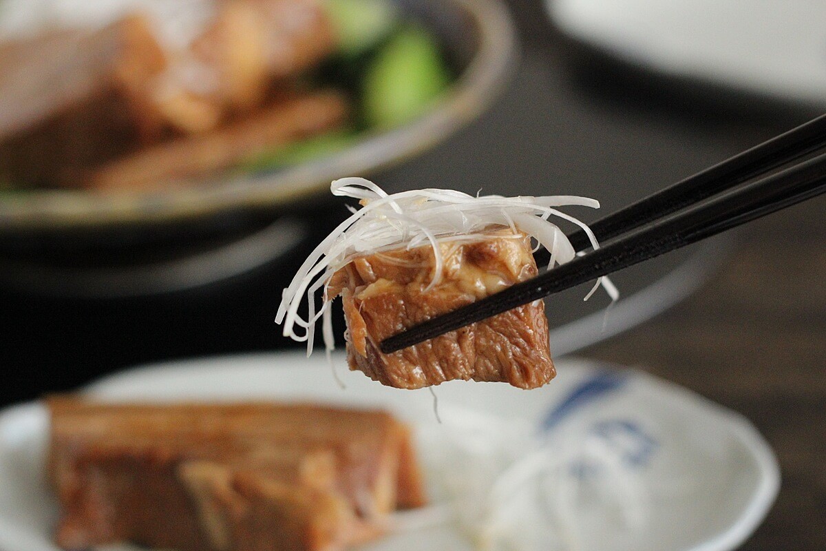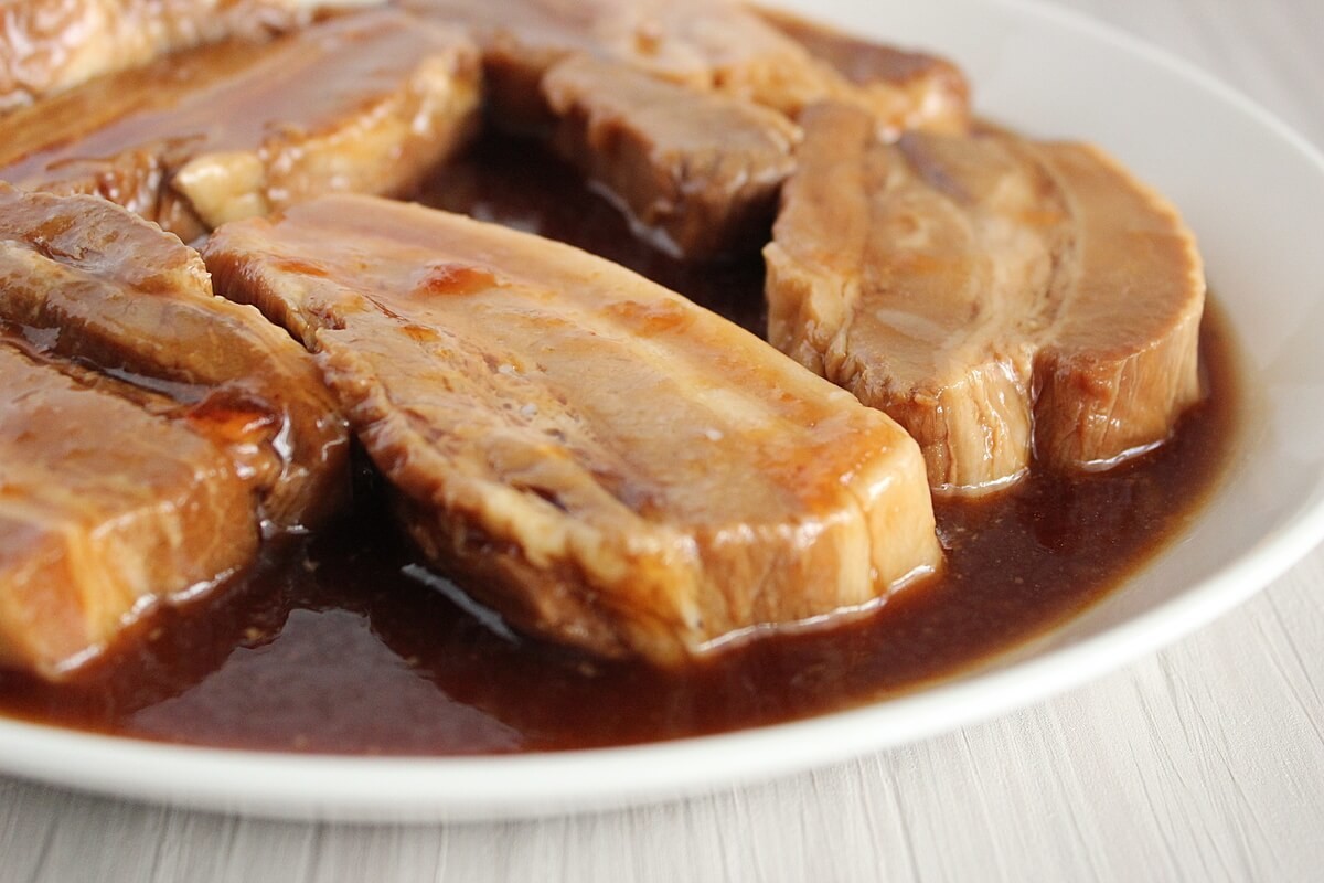 豚の角煮は脂を抜くためにおから入りの熱湯で何時間も茹で、そして更に味をつけるために煮込む……。