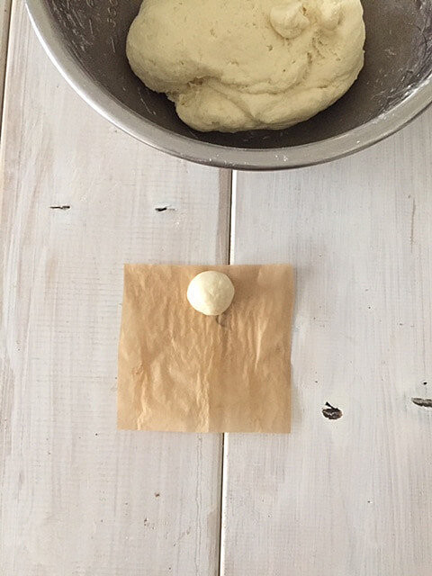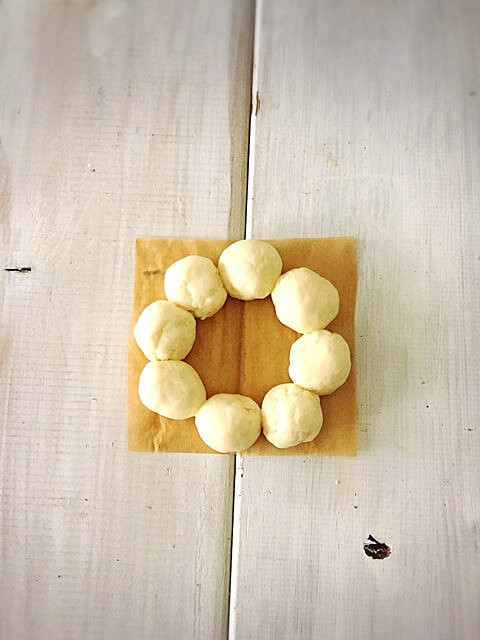 2、この生地を5等分し、それぞれの生地をさらに8等分して丸めていきます。