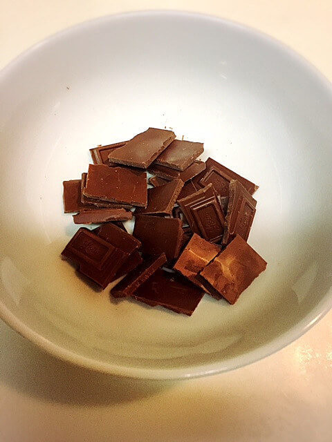 ドーナツがすっぽり入るくらいの器に 割った板チョコを入れて、湯煎にかけて柔らかくします。