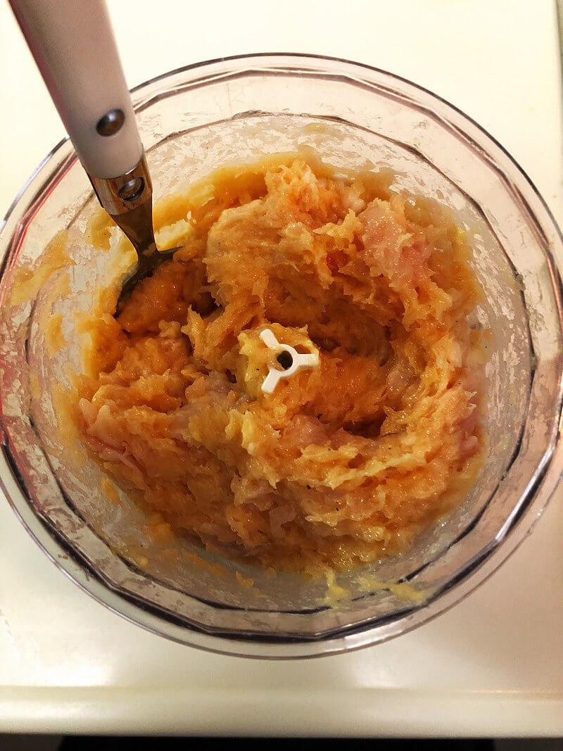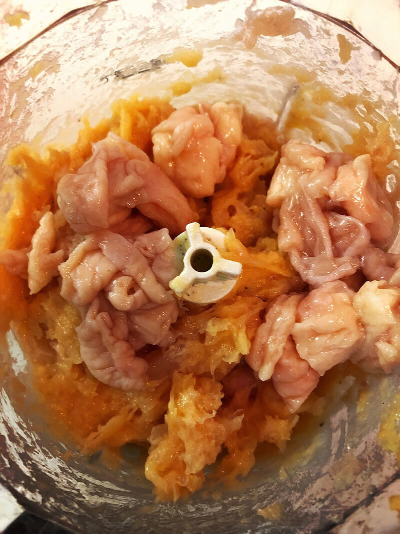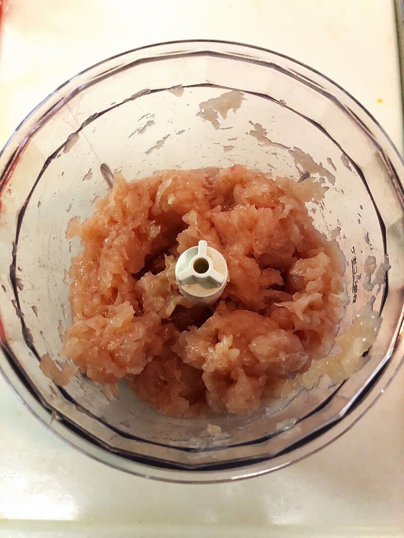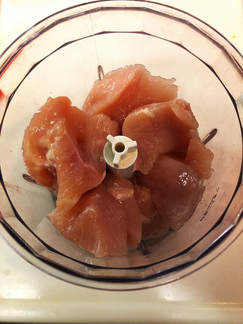1、鶏肉の皮を外して、フードプロセッサーで粗めにひいておきます。