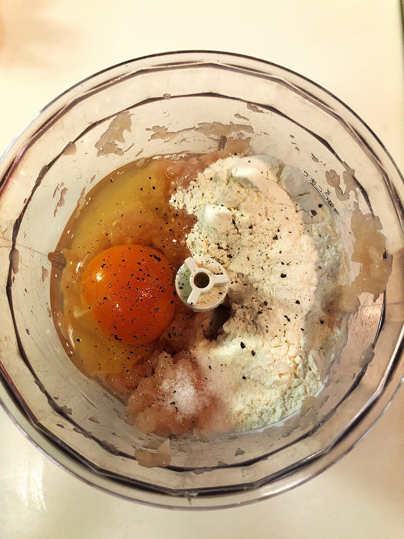 3、1に小麦粉、卵、塩、こしょうを入れて、フードプロセッサーにかけて混ぜ、 混ざったら、2の鶏皮も入れて混ぜます。